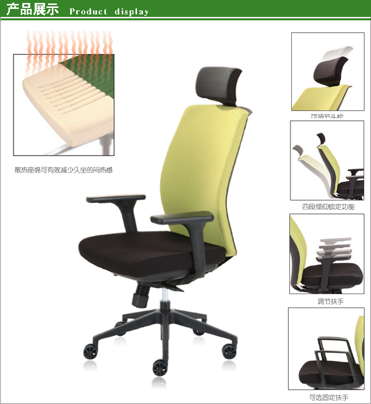 *軟墊背和座,提供舒適的支撐; *四段傾仰鎖定底盤,帶有傾仰調(diào)節(jié)功能; *座棉散熱槽可減少20%左右的人體熱量,避免久坐悶熱。 *座面采用優(yōu)質(zhì)阻燃布,久坐不變形; *軟硬適中觸感舒適